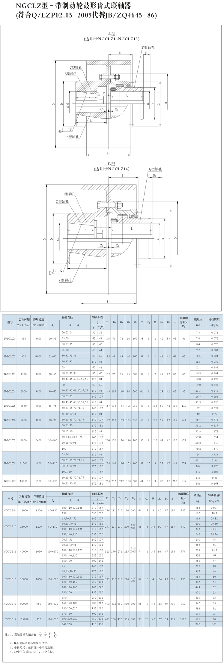 NGCLZ12帶制動輪鼓形齒式聯(lián)軸器的結(jié)構(gòu)是由兩具有相同齒數(shù)的外齒軸套和兩帶有凸緣的內(nèi)齒圈零件組成。兩外齒軸套分別用鍵銜接固定在被鏈接兩軸的軸端,兩內(nèi)齒圈的內(nèi)齒與軸套上的外齒相嚙合,其凸緣用螺栓鏈接,從而完成兩軸的鏈接,外齒軸套及內(nèi)齒圈上的齒輪為嚙合角a=20°的漸開線齒。NGCLZ型齒式聯(lián)軸器為帶制動輪式鼓形齒式聯(lián)軸器,詳細規(guī)格見下表。